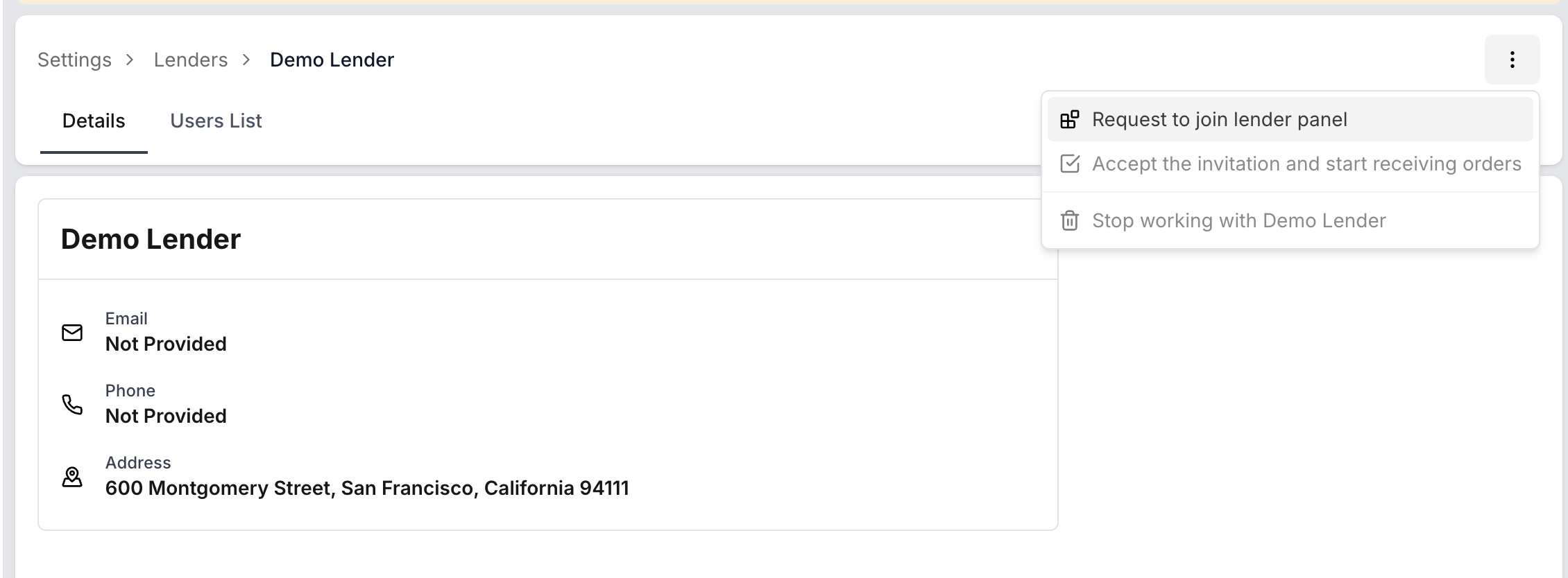 After establishing a connection with a lender, a User List tab becomes available on that lender’s profile. Here, you can: