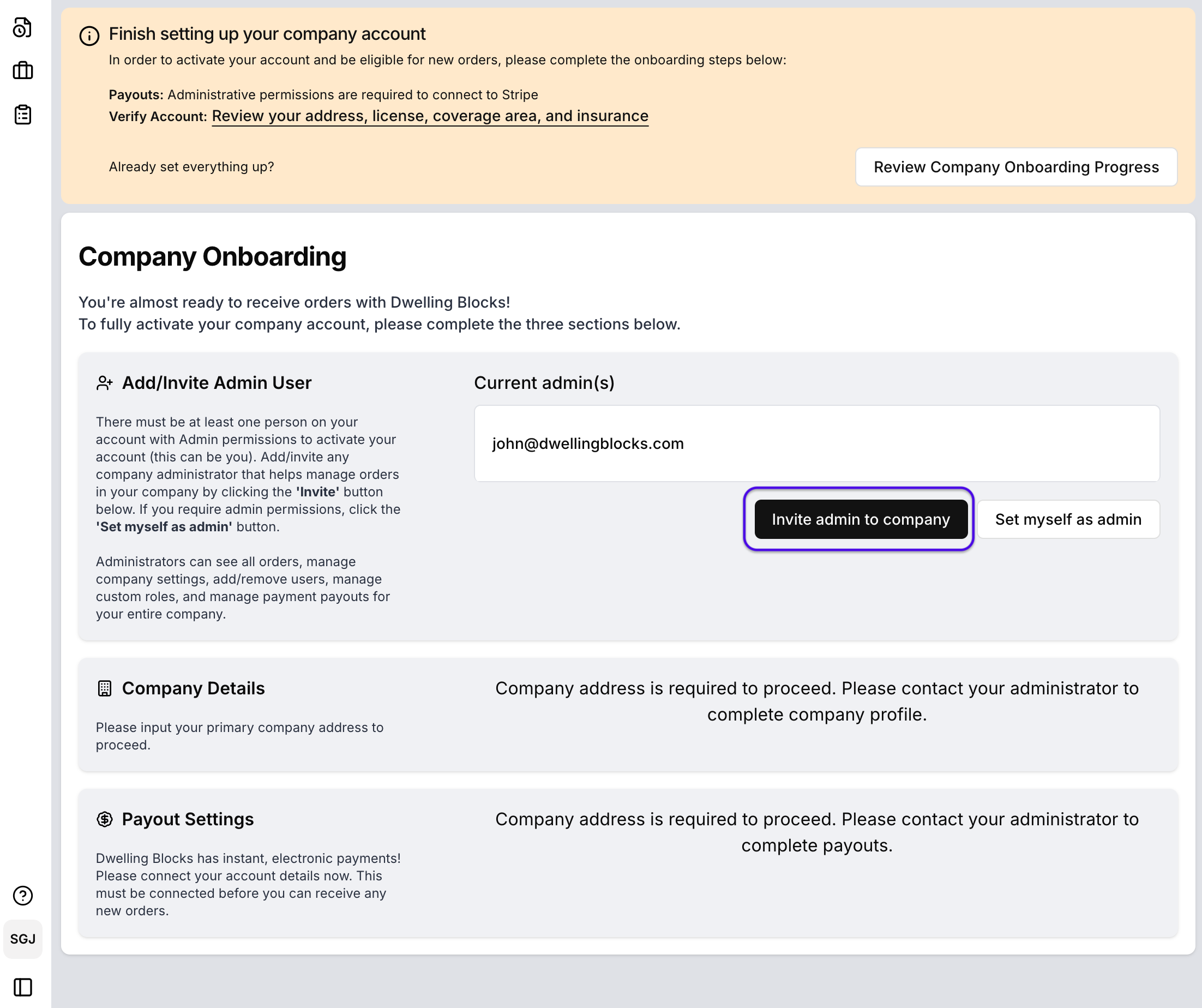 If you see a warning to finish setting company account, click on the "Review Company Onboarding Progress" button. Make sure Add/Invite Admin User section has admin company email.