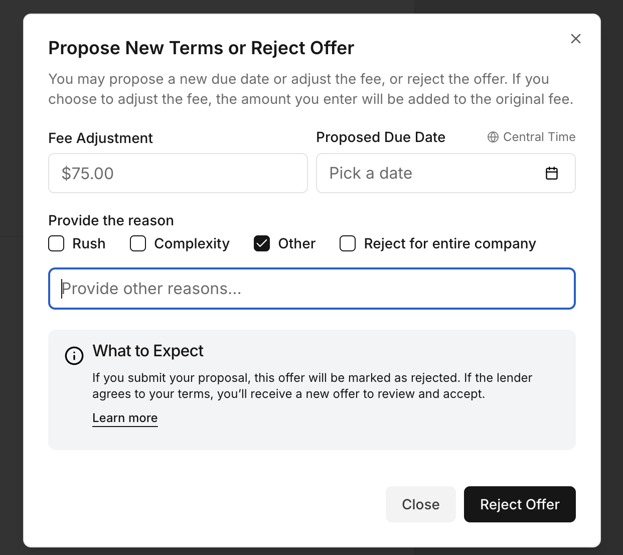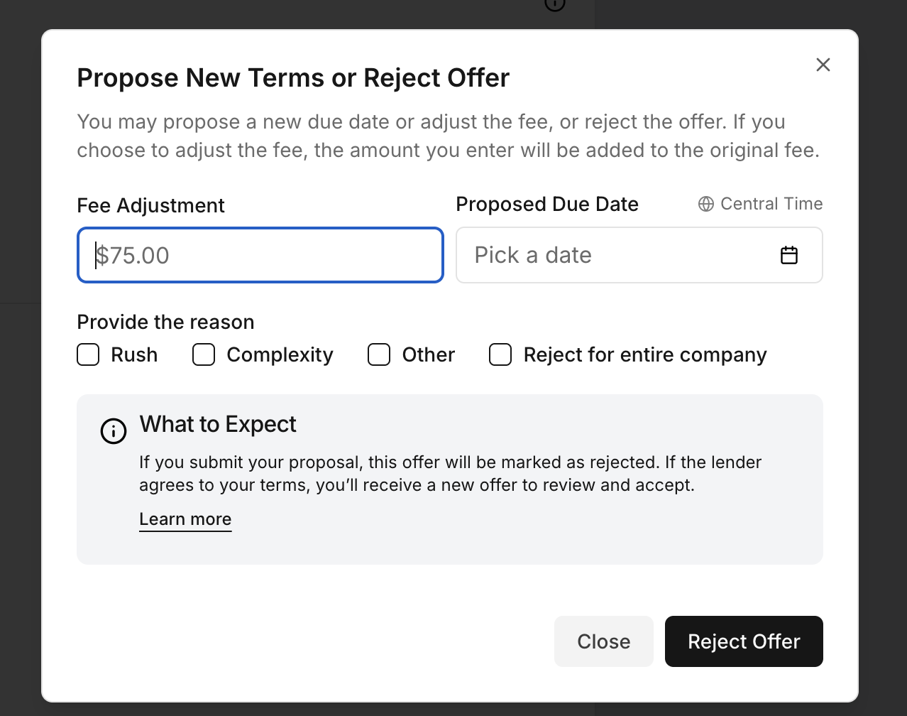 Click the “Submit Conditions/Reject” button to open the “Propose New Terms” dialog.