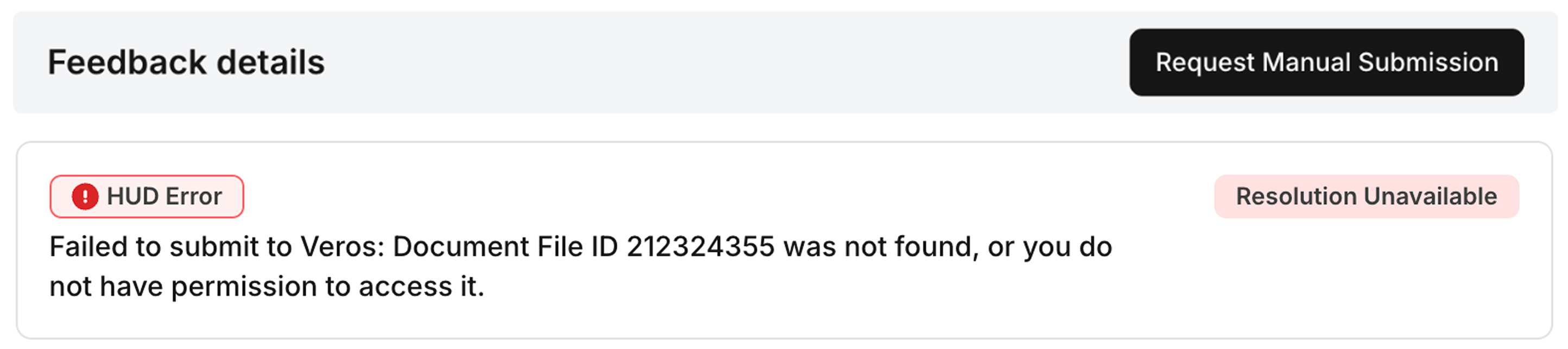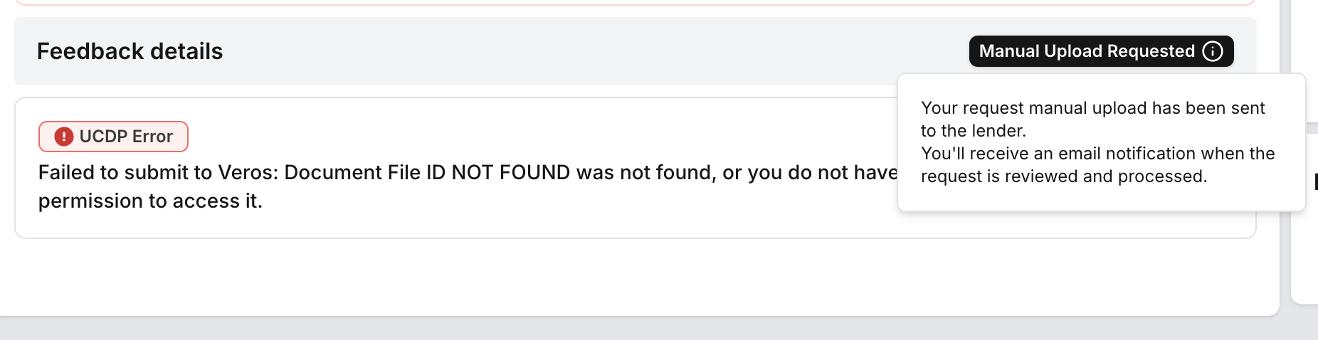 Explain why error can be resolved and need manual upload assistance from lender.Request Manual Submission