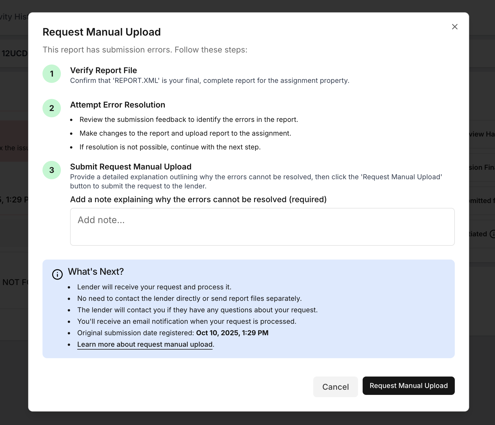 If a report submission encounters an error that cannot be resolved, the user can request a manual submission from the lender. This guide explains how the feature works and the steps to follow.