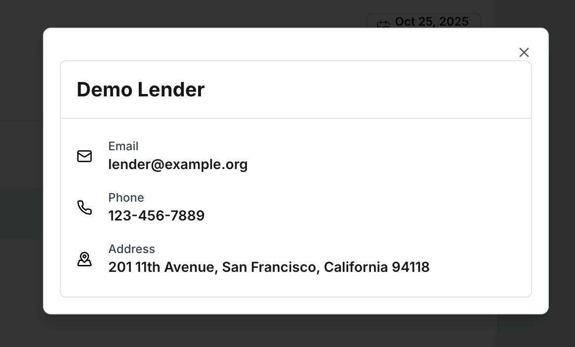 In the dialog, you'll find the lender's key contact information, including email, phone number, and mailing address - so you know exactly how to reach them.