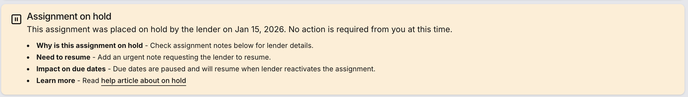 After the lender reviews your note, they will place the assignment on hold and all current due dates will be removed. A banner in the assignment will confirm that the lender has put the file on hold and that no action is required from you until it is resumed.